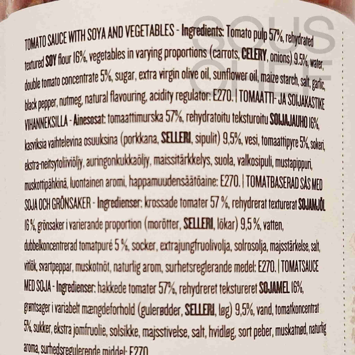 Product formulations and details may change. For the latest ingredients and allergen information always check product packaging prior to consumption. Ingredients: Tomato pulp 57%, rehydrated soy protein 16%, vegetables in variable proportions (carrots, celery, onions) 9.5%, water, 5% double tomato concentrate, sugar, extra virgin olive oil, sunflower oil, corn starch, salt, garlic, black pepper, nutmeg, natural flavor, acidity regulator: e270.