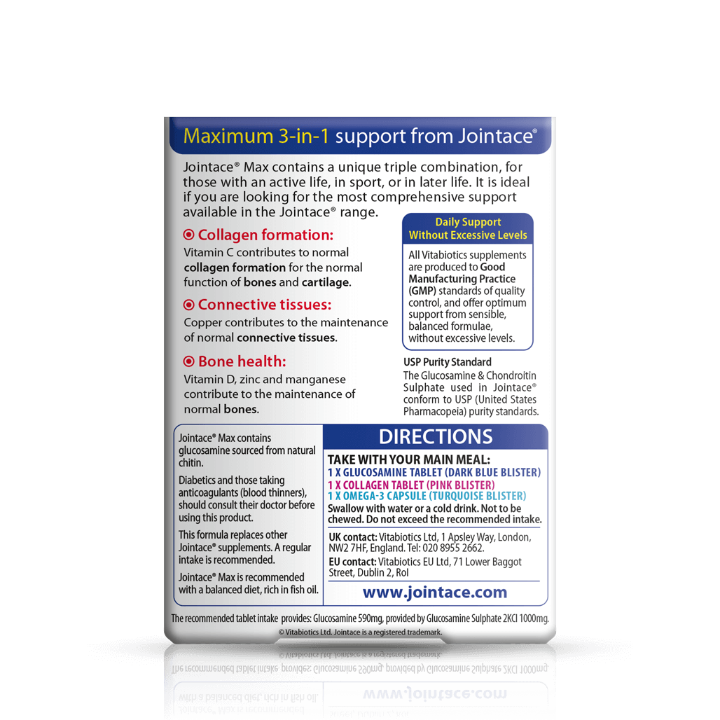 Good things come in threes – and Jointace Max gives you triple support with collagen, glucosamine and chondroitin, and super-strength Omega-3 in one box.