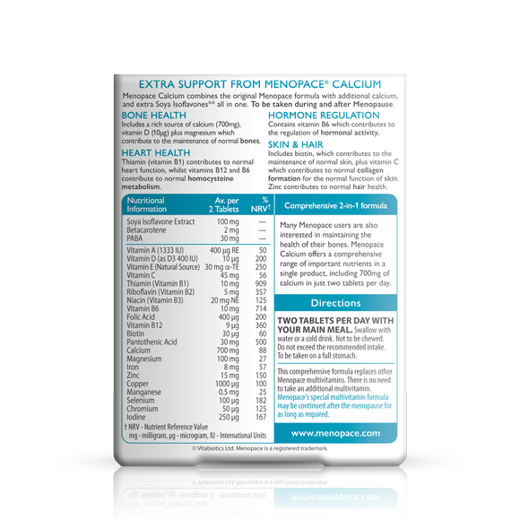 Looking after your bone health is a priority during the menopause, Menopace Calcium is a comprehensive formulation of 24 nutrients including 700mg of calcium.