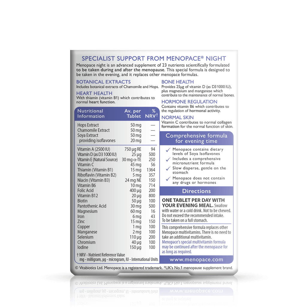 An advanced formulation of Menopace with the addition of Chamomile and Hop extracts to be taken at night time.