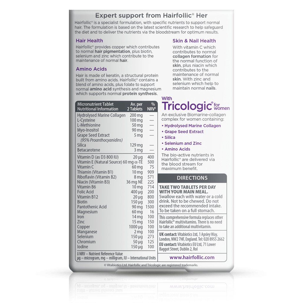 Specially formulated for women, Hairfollic Her supports healthy hair with 26 nutrients including our exclusive Tricologic Biomarine-collagen complex.