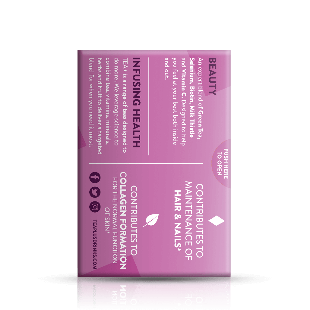 Infused with a delicious blend of vitamins, herbs, fruit and green tea. TEA+ Beauty Vitamin Tea helps with your daily wellness goals.